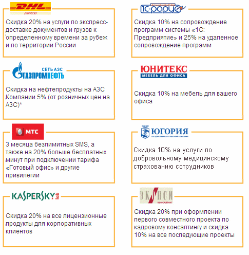 Сократите затраты на обслуживание корпоративных автомобилей, мобильную связь, курьерские услуги, мебель для офиса, а также получайте скидки на страхование и обучение сотрудников, программное обеспечение и многое другое.